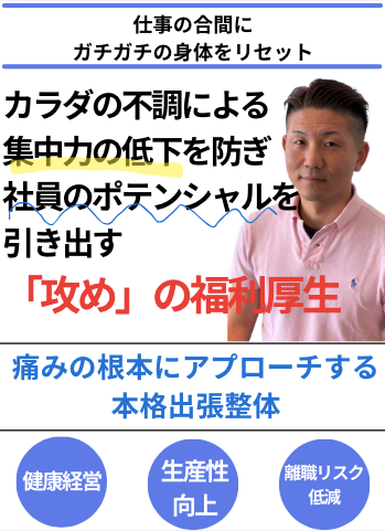 当院の出張整体は、単なる癒やしではなく、“動ける体”を取り戻すための根本治療をオフィスで提供します。